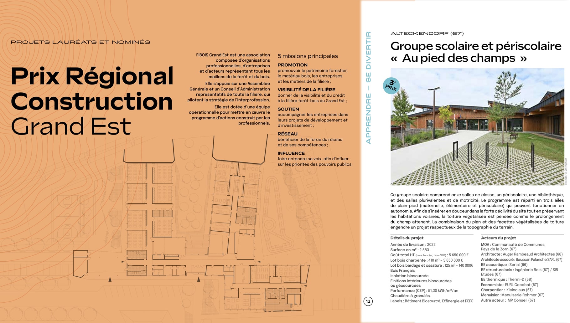 Nous avons appris avec plaisir que le groupe scolaire et périscolaire ”au pied des champs” d’Alteckendorf a été classé 3e pour le prix régional de construction Fibois Grand Est 2024.
