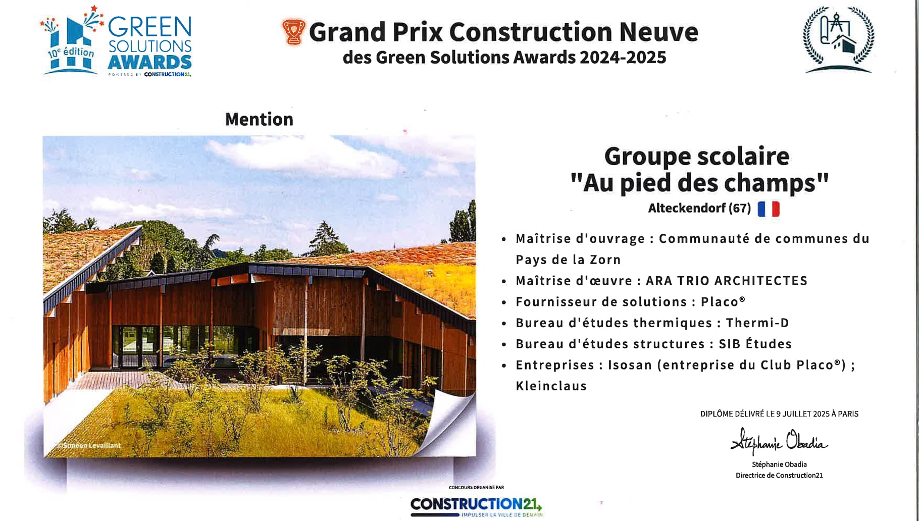 Le groupe scolaire et périscolaire "Au pied des champs" a reçu la mention du Grand Prix Construction Neuve organisé par Construction 21