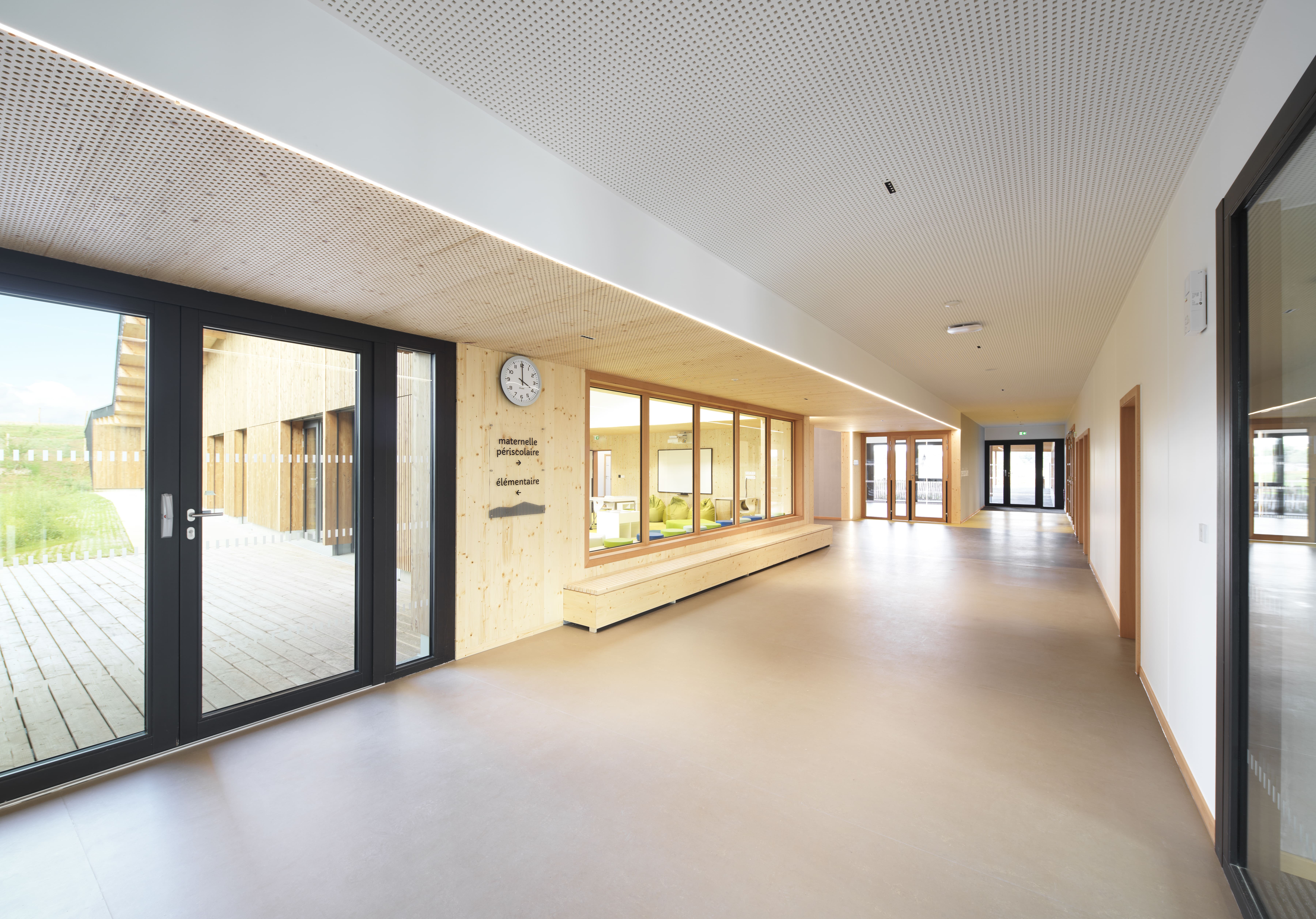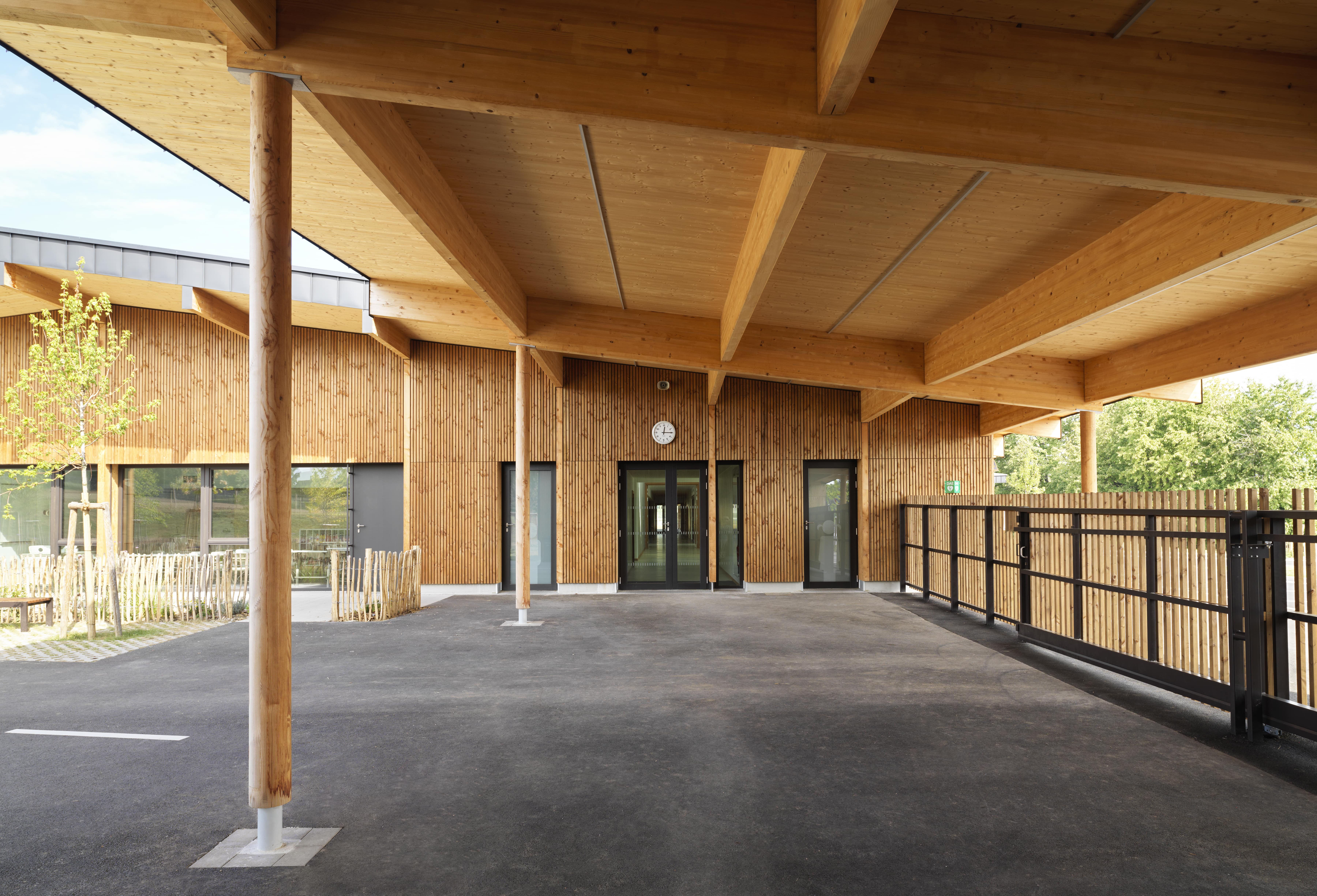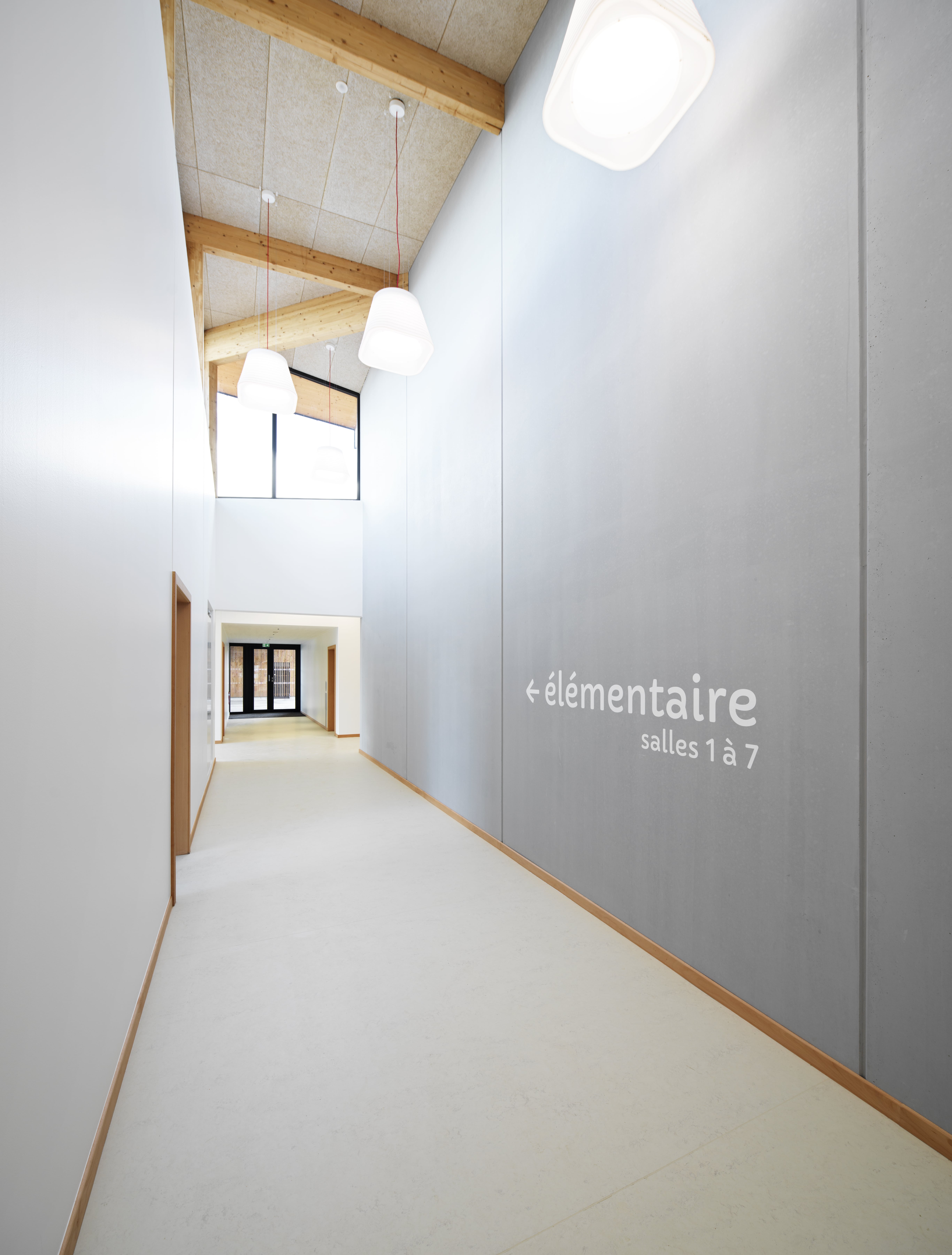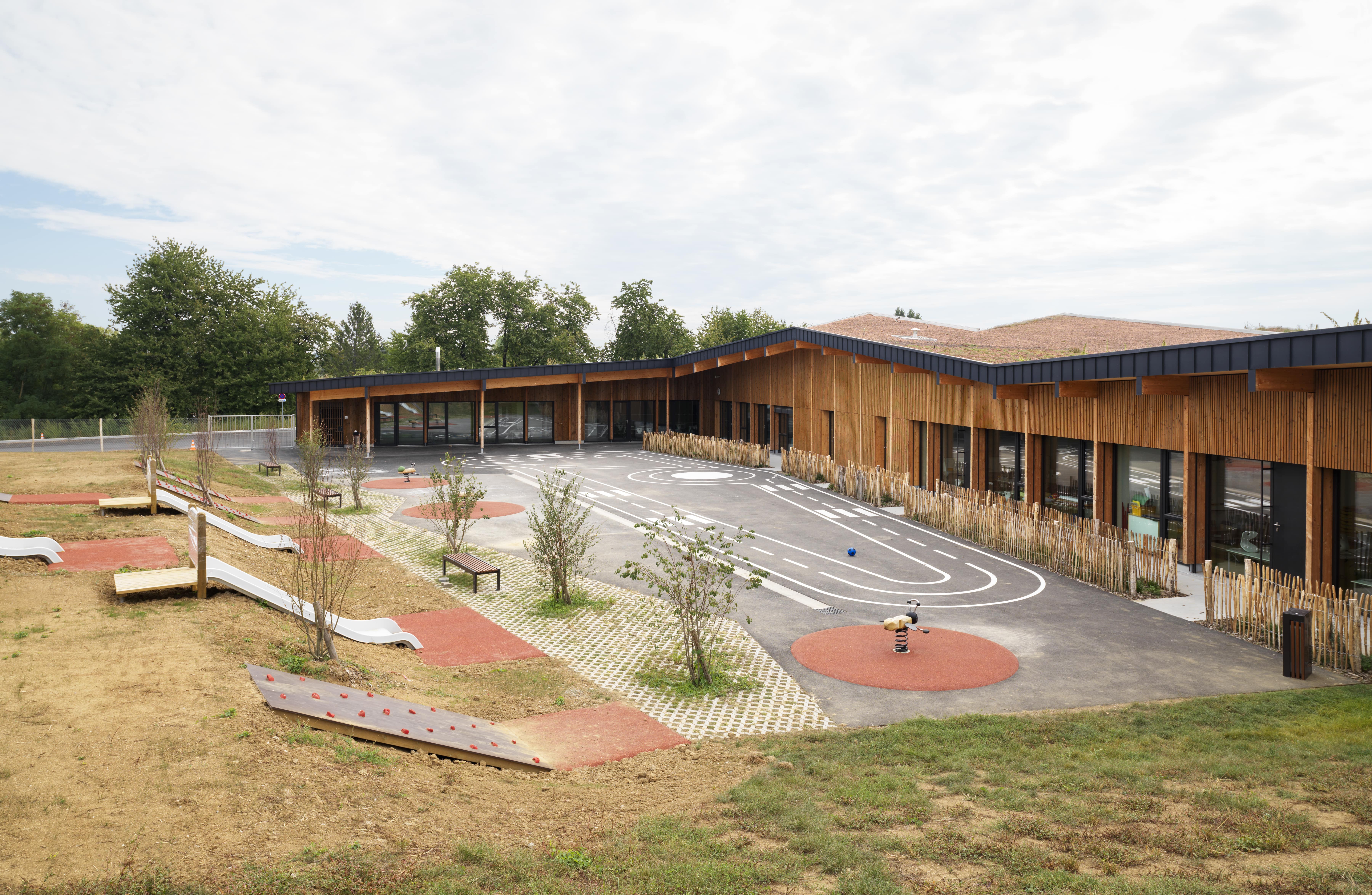 Le bâtiment s’intègre dans le site en pente, avec continuité des toitures des deux ailes maternelle et élémentaire coté ouest. Il vise un objectif E2C1 : murs à ossature bois, charpente bois, isolation laine de bois, isolation acoustique Métisse, linoléum, habillages acoustiques intérieurs en bois, …