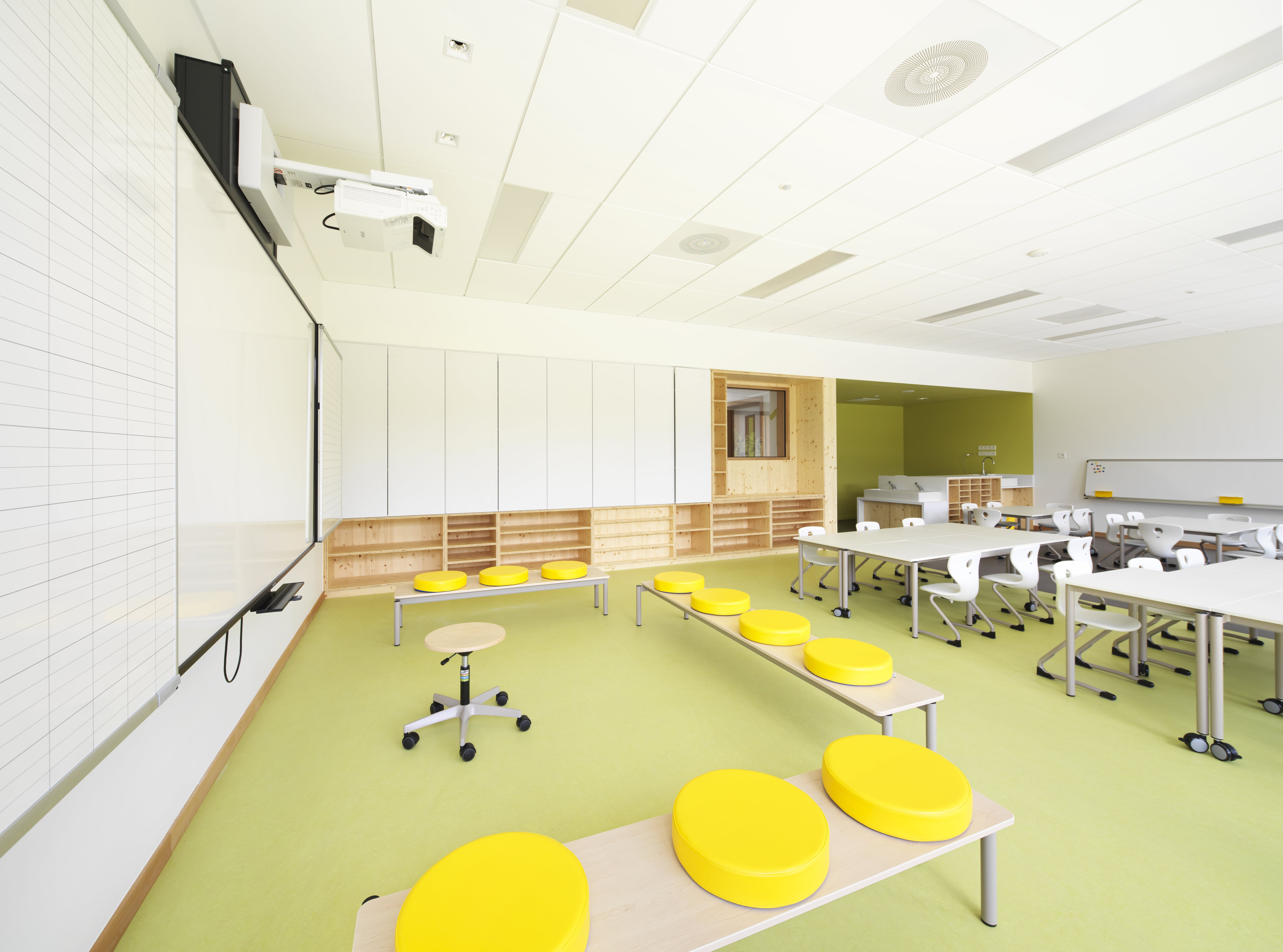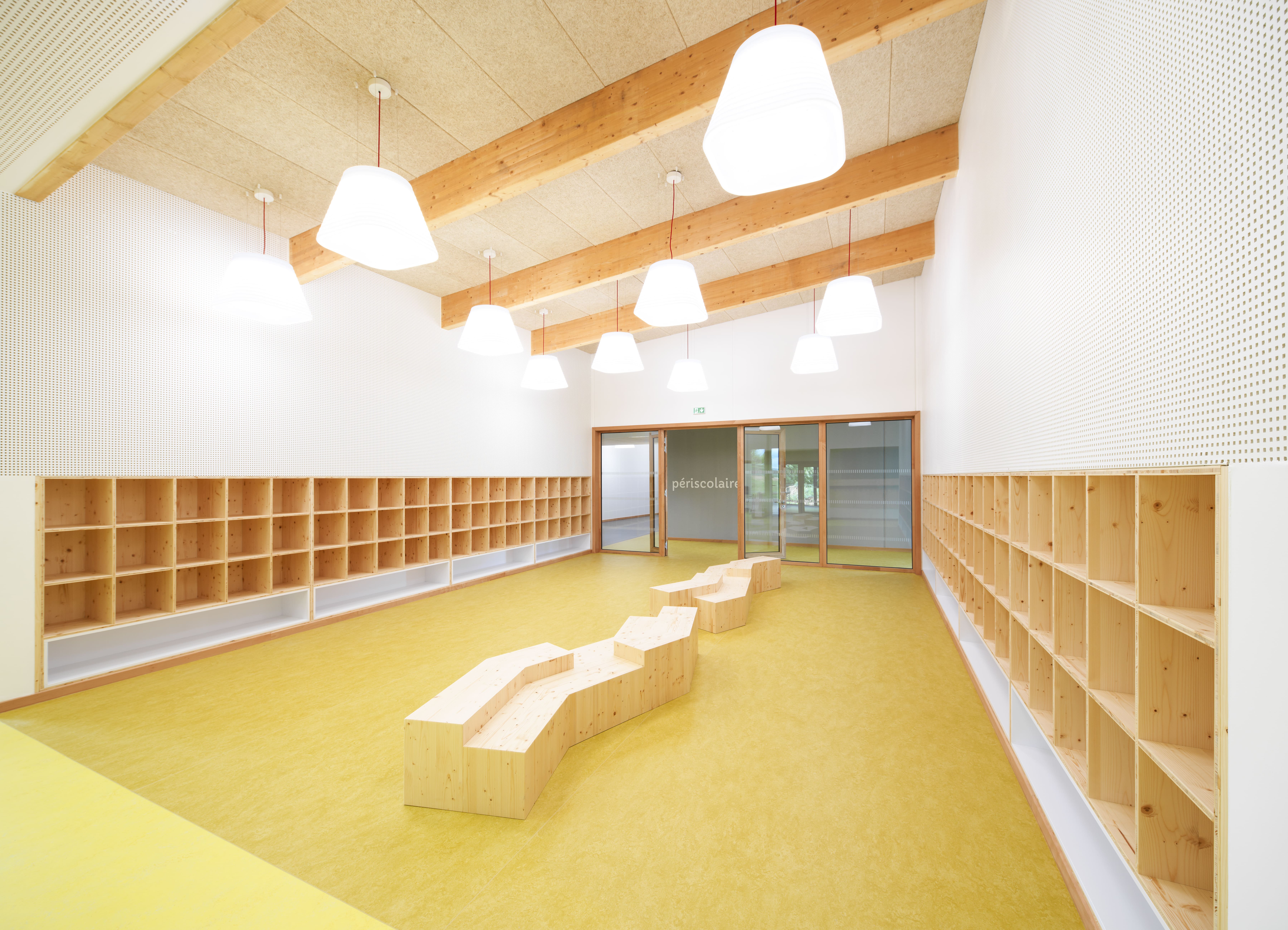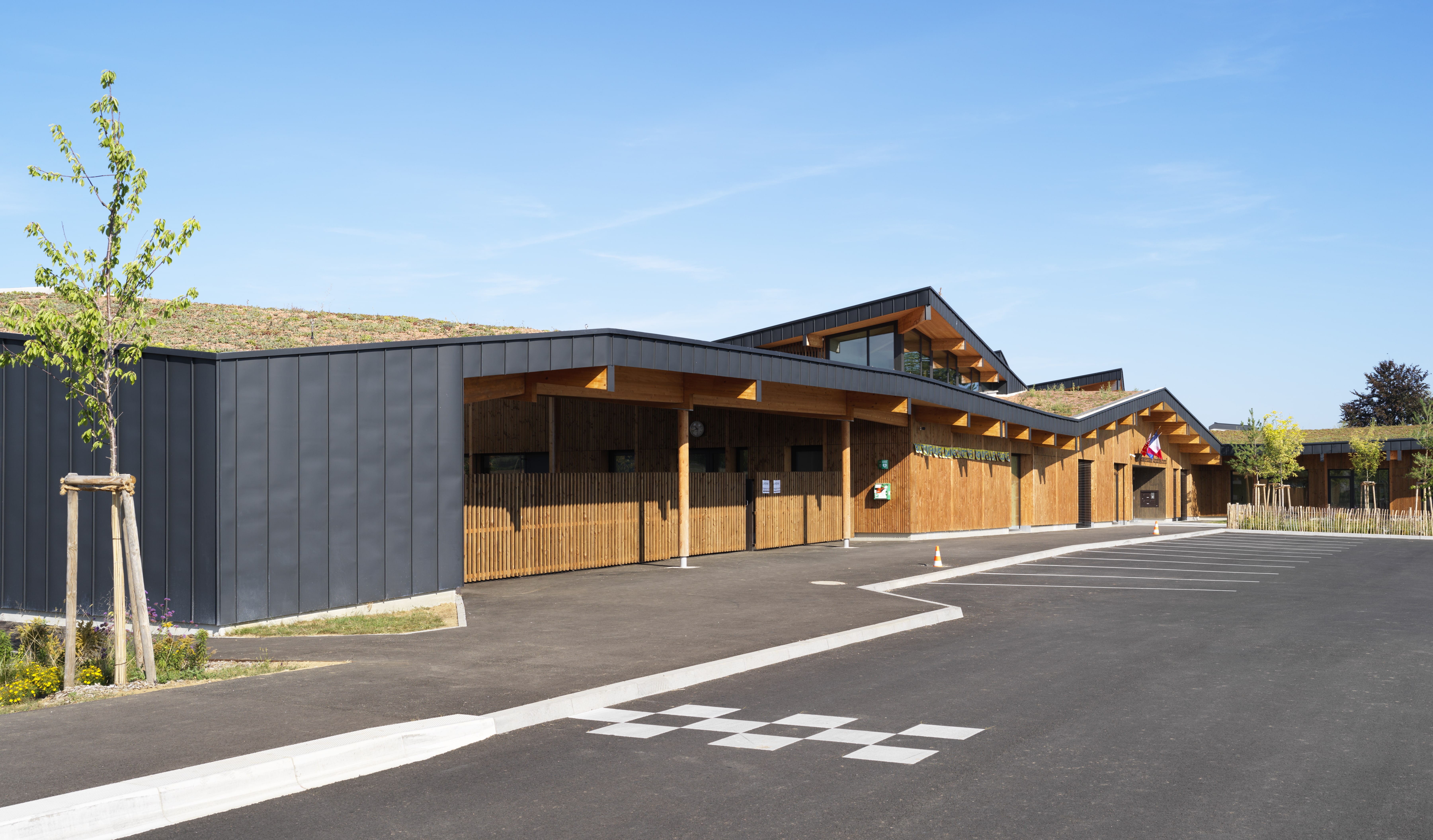 Le bâtiment s’intègre dans le site en pente, avec continuité des toitures des deux ailes maternelle et élémentaire coté ouest. Il vise un objectif E2C1 : murs à ossature bois, charpente bois, isolation laine de bois, isolation acoustique Métisse, linoléum, habillages acoustiques intérieurs en bois, …