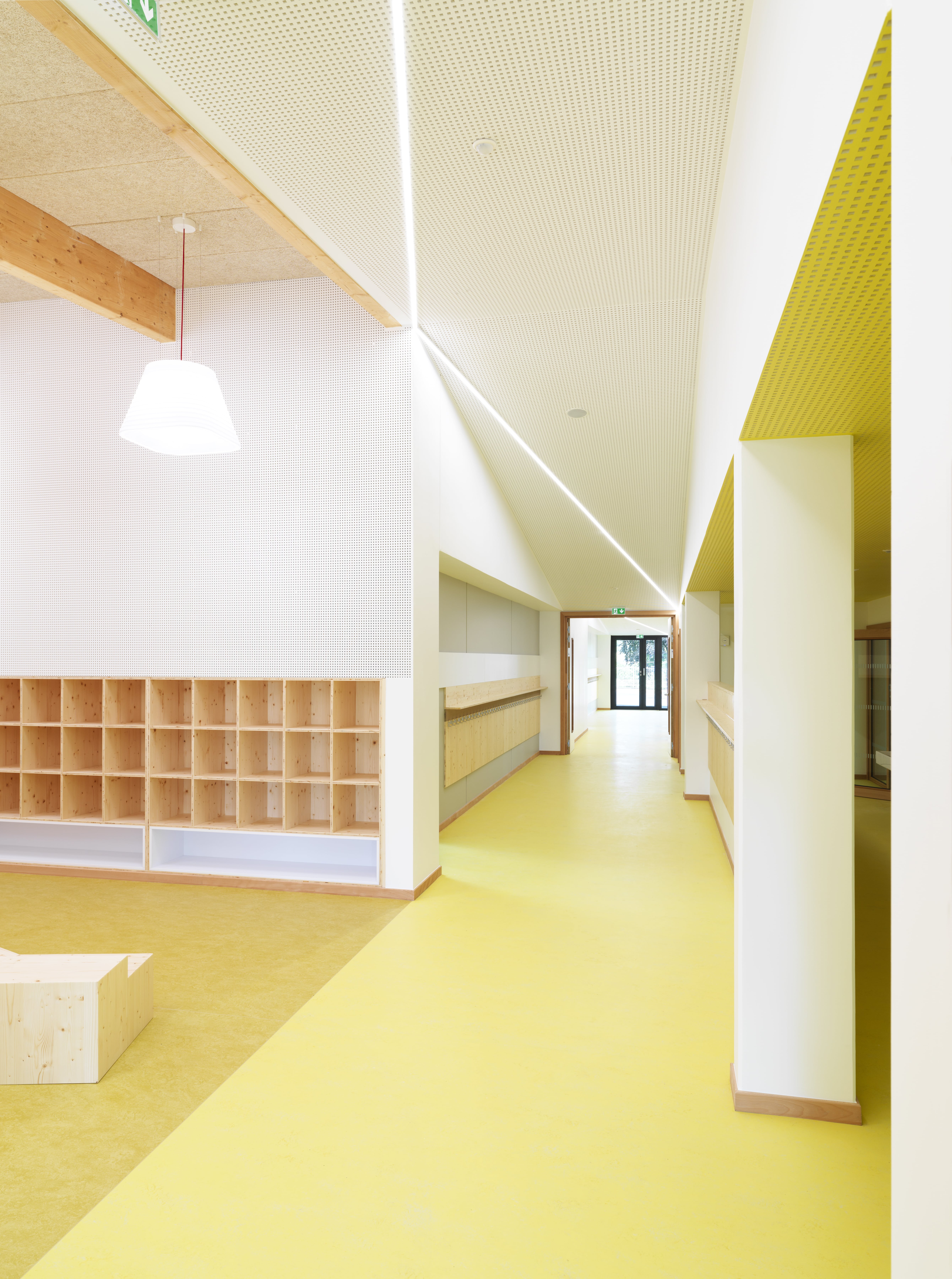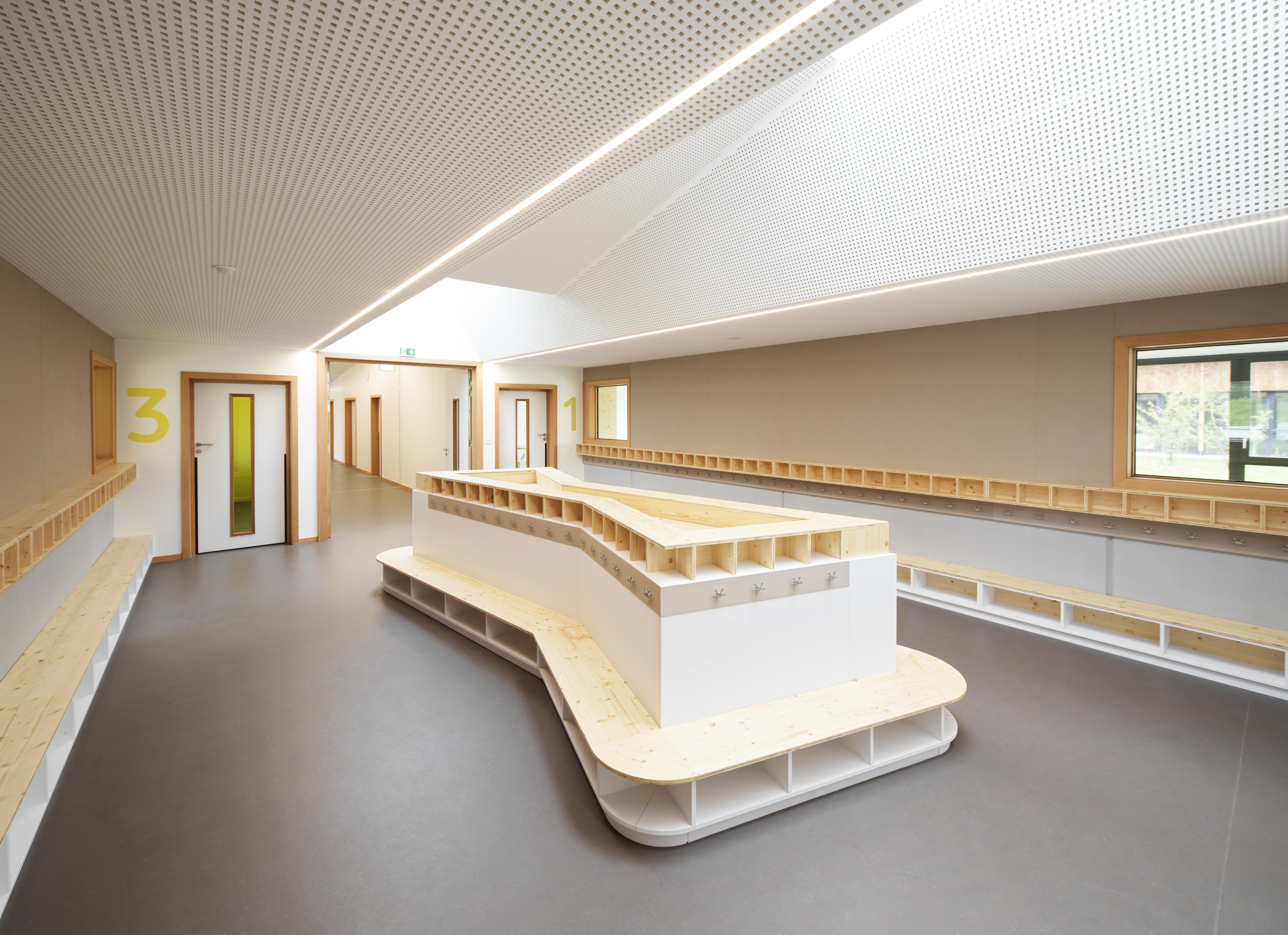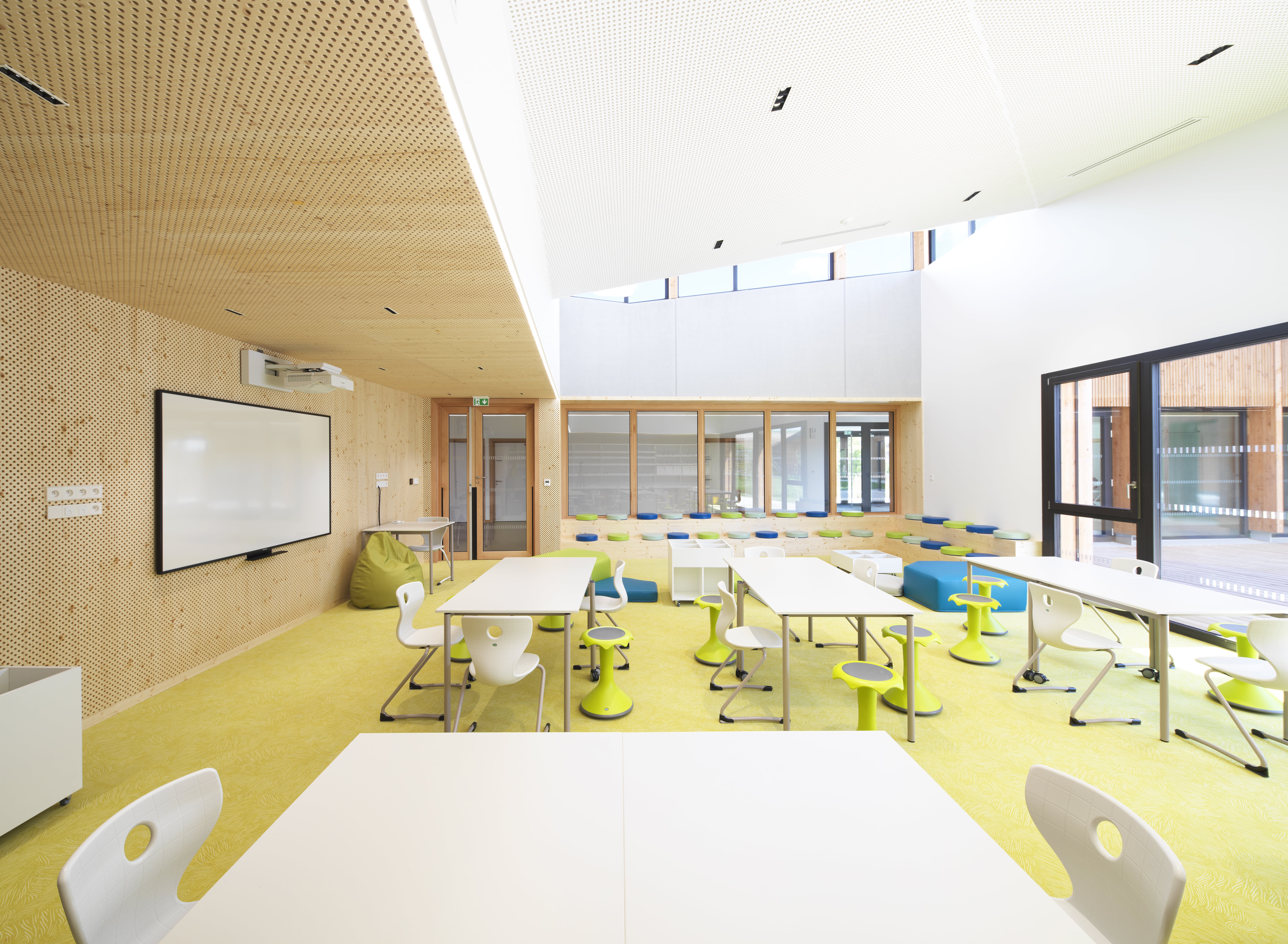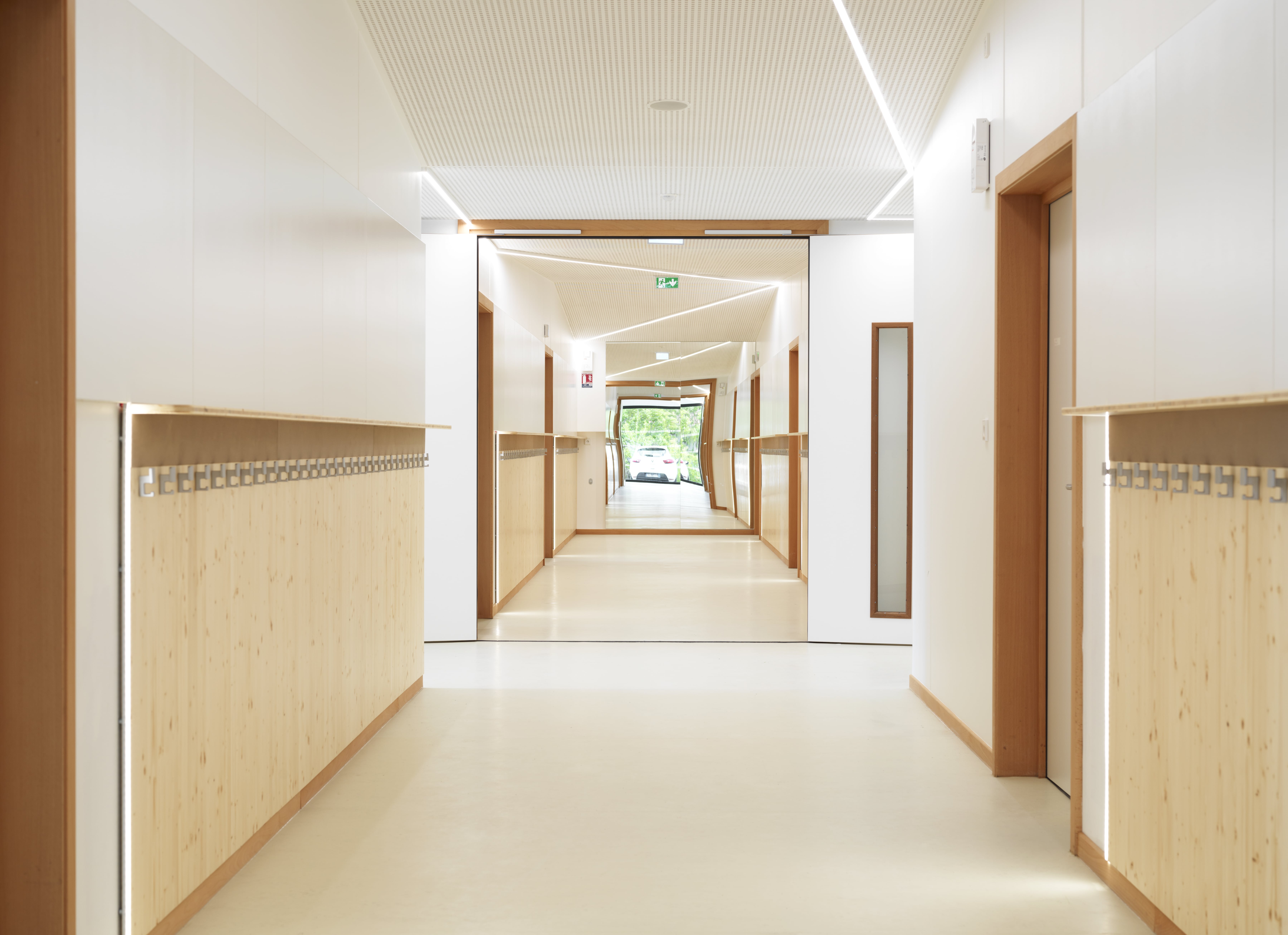Le bâtiment s’intègre dans le site en pente, avec continuité des toitures des deux ailes maternelle et élémentaire coté ouest. Il vise un objectif E2C1 : murs à ossature bois, charpente bois, isolation laine de bois, isolation acoustique Métisse, linoléum, habillages acoustiques intérieurs en bois, …