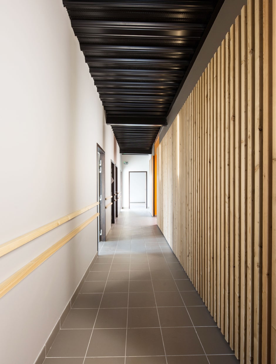 Les claustras bois tantôt pare-soleil, tantôt pare-vue, contribuent à donner une image homogène au projet ; ils connectent les volumes, l'intérieur à l'extérieur.