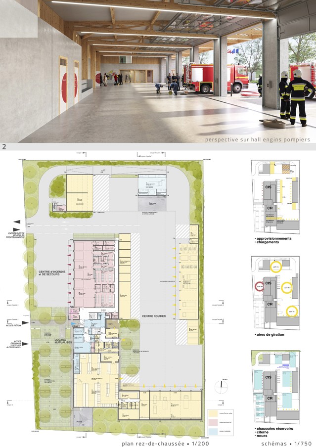 7 travées de véhicules de secours, 14 travées de véhicules d'entetien, vestiaires, bureaux, locaux communs