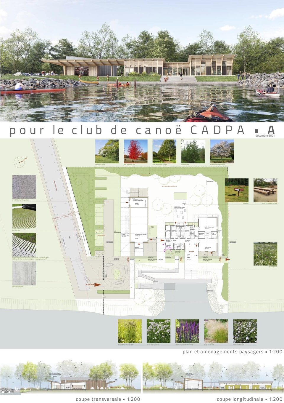 Pour s'insérer harmonieusement dans son site, et jouer aussi son rôle d'équipement sportif spécialisé d'un club actif et dynamique, le projet architectural et paysager est à la fois discret, pour être respectueux de cet environnement végétal privilégié en bord de Rhin, et visible, pour pouvoir être identifié comme un équipement majeur de la vie sportive de Huningue.
