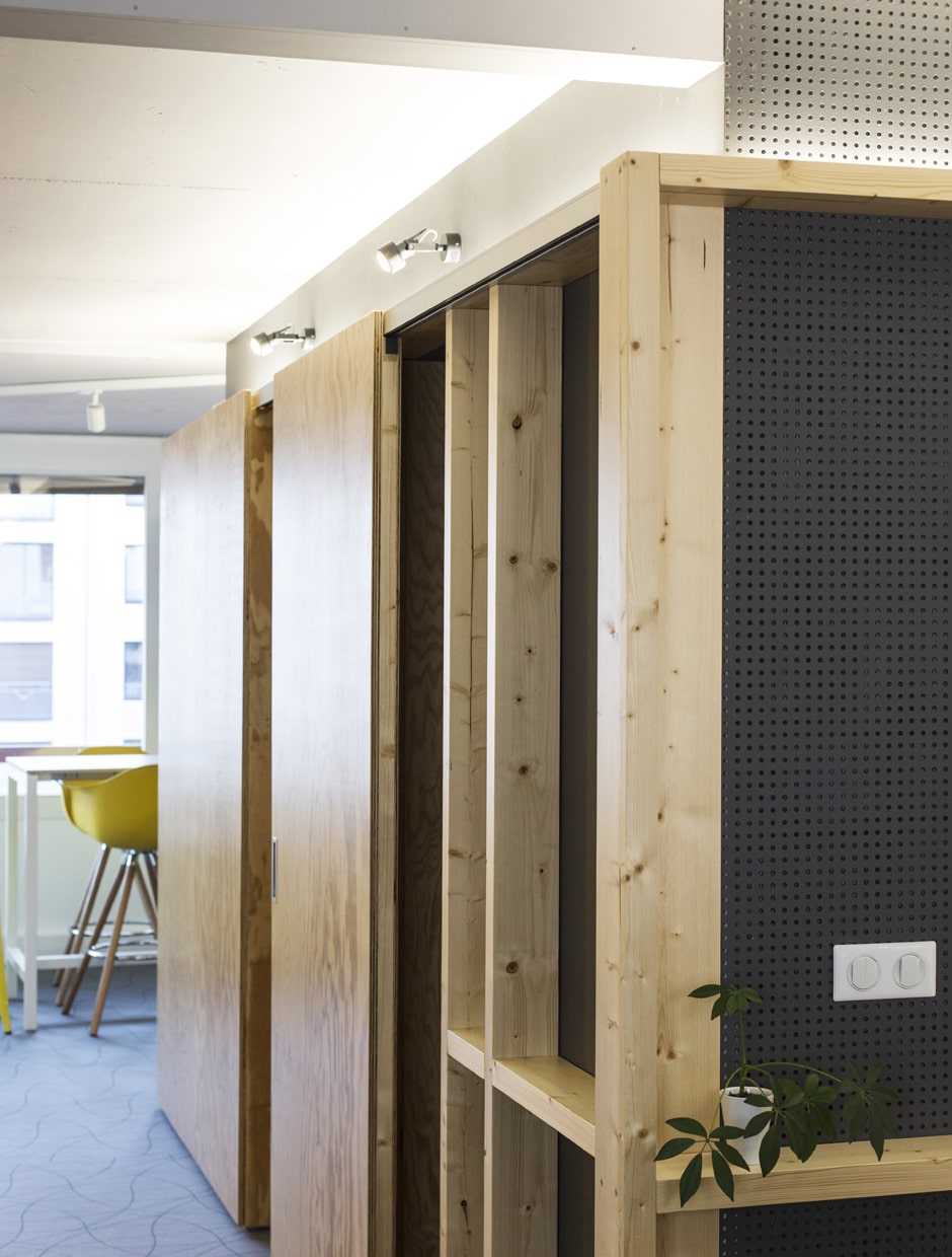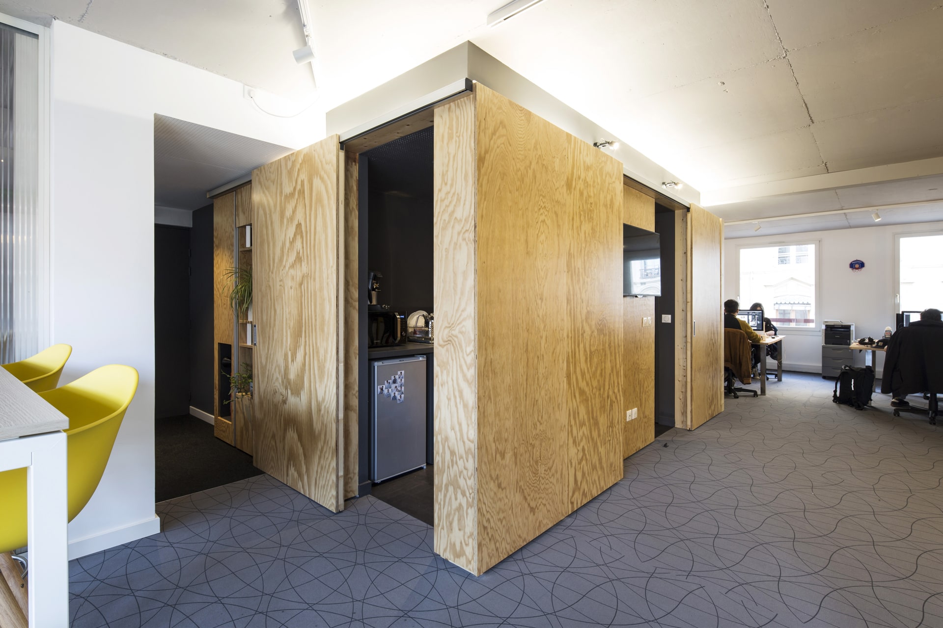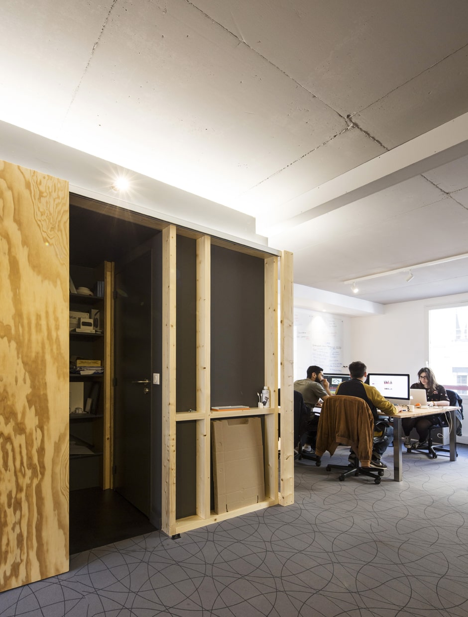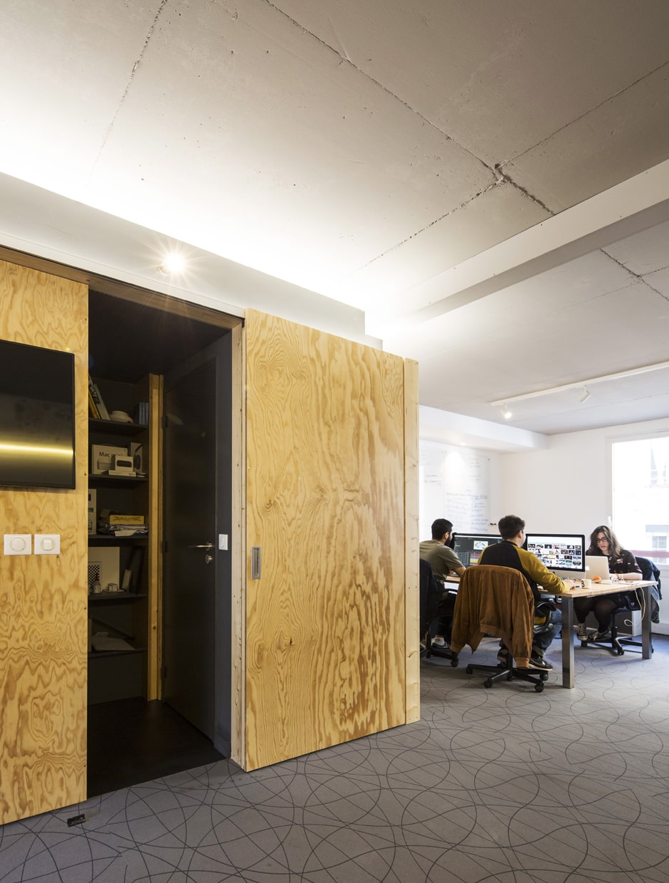 • la salle "blanche" de travail, modulable 1-2-3; travail / détente / réunions • la "boite" translucide autonome pour un travail en "aparté".