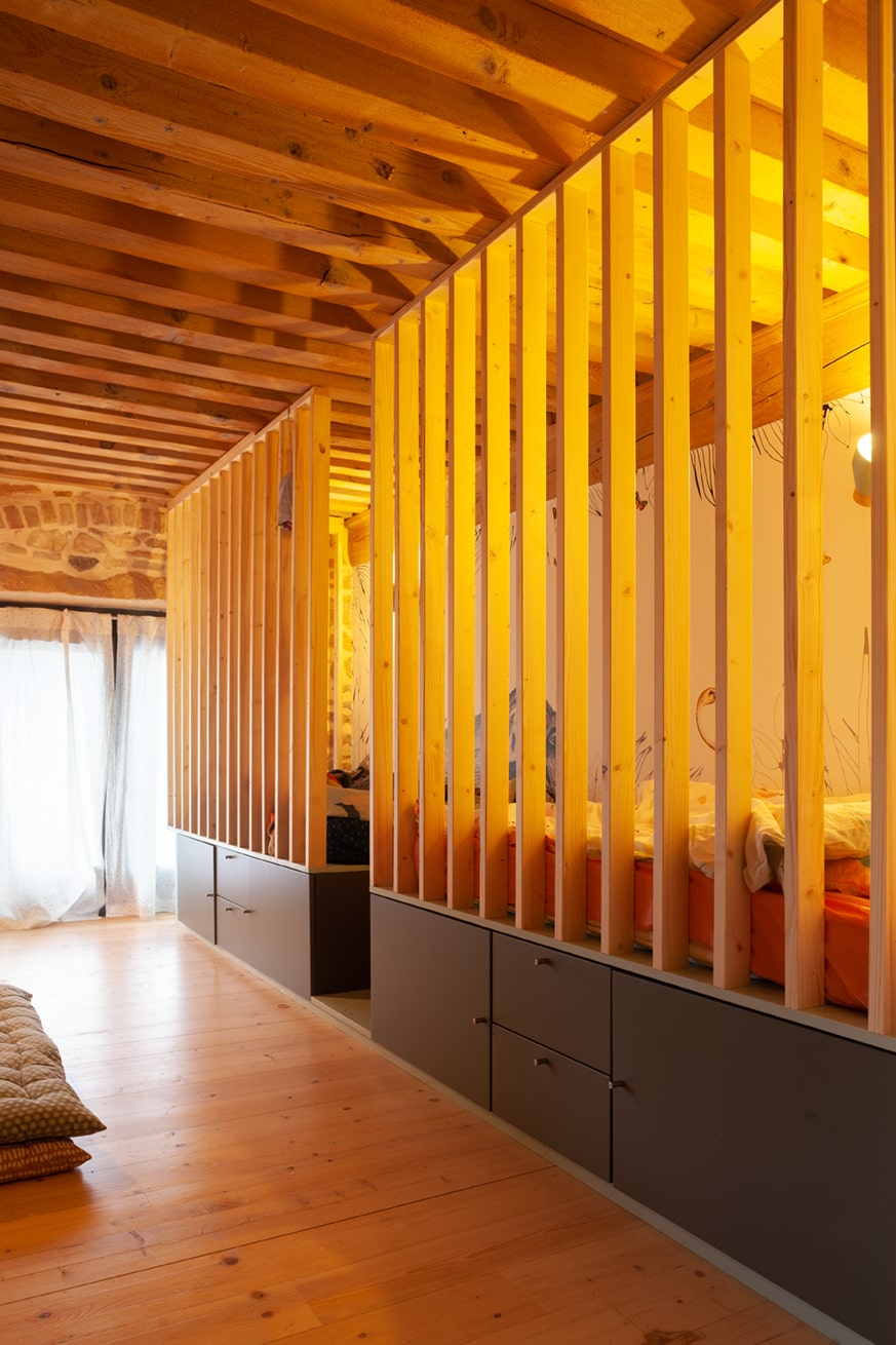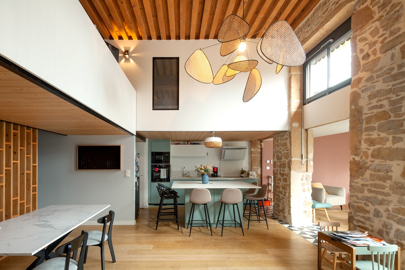 Des matériaux naturels, contreplaqué bouleau, bois clair, zinc, …, et des apports ponctuels de couleur, viennent renforcer les matériaux existants (poutre bois, mur pierre, …).