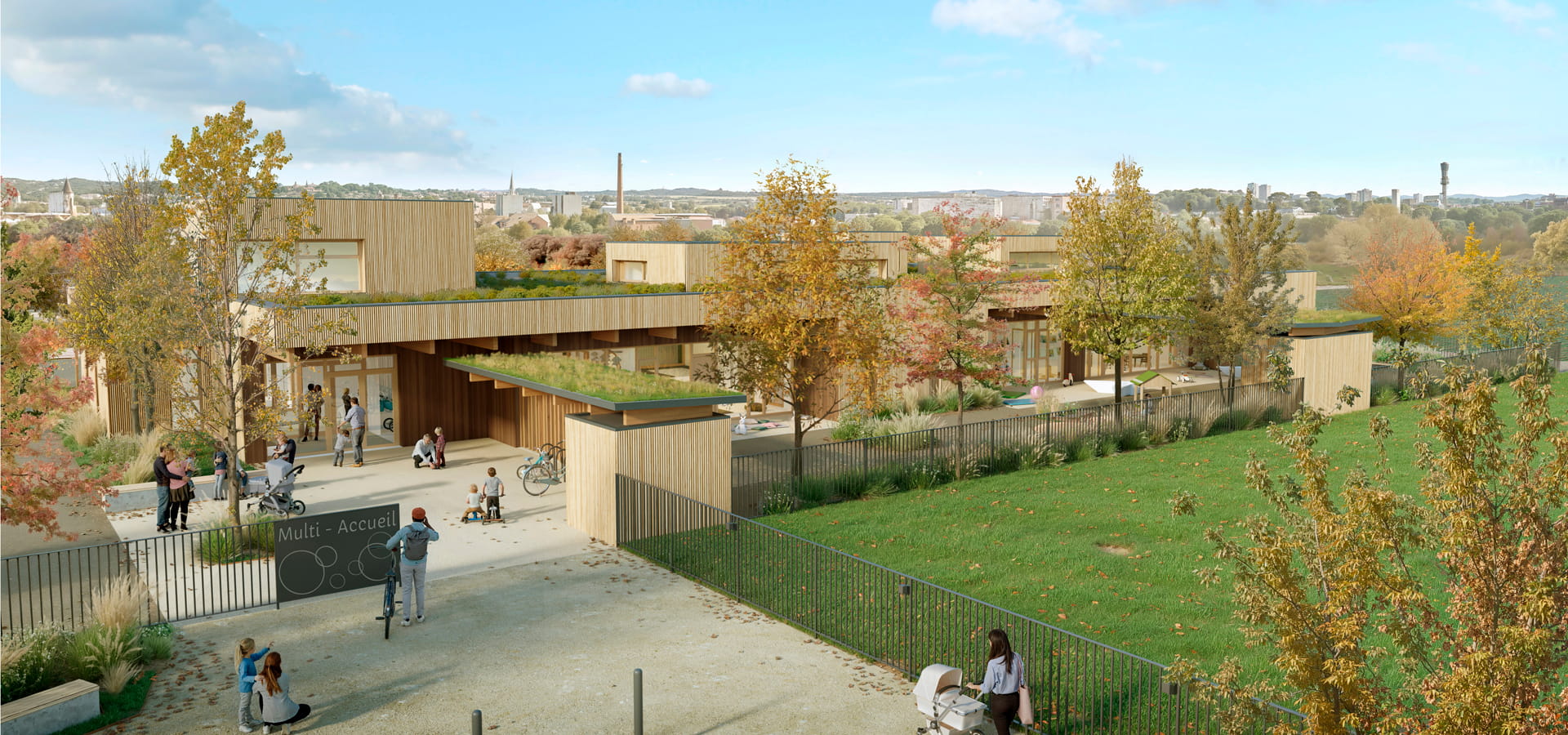 Les espaces des enfants s’ouvrent largement sur des jardins paysagers grâce à de grandes baies vitrées et des terrasses semi-couvertes adaptées.
