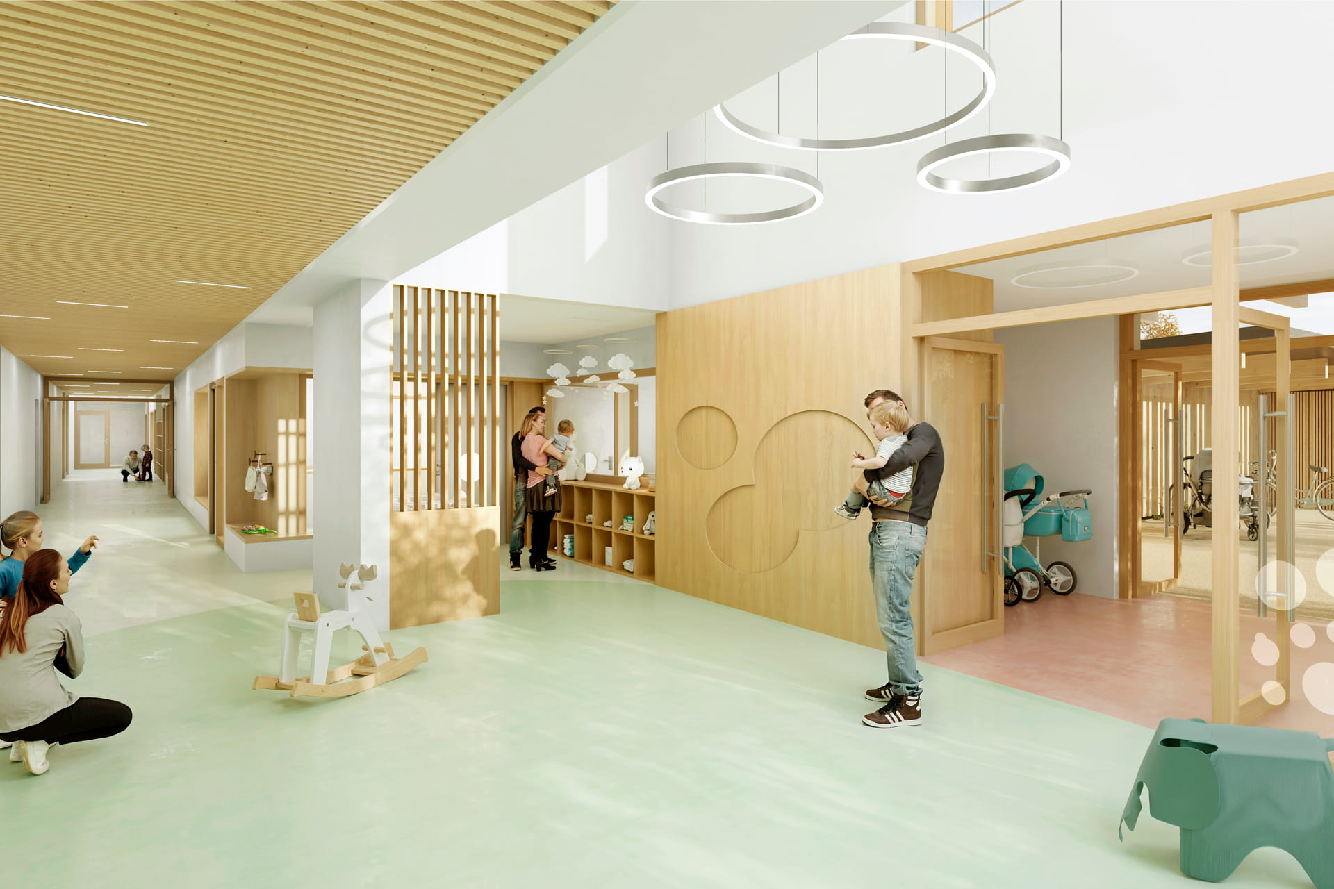 Les circulations sont lumineuses et rassurantes, et le confort est assuré par des protections solaires, des matériaux sains, une acoustique soignée et des ambiances douces adaptées aux enfants.