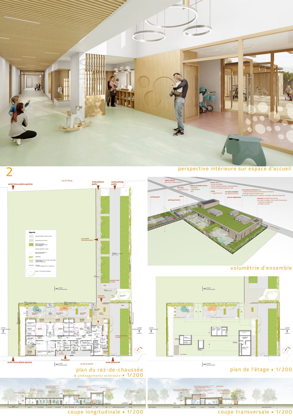 Le projet de multi-accueil est implanté pour être visible depuis la rue de l’Étang, avec un parvis situé dans l’axe de l’allée piétonne et du futur parking, menant à un hall d’entrée abrité et identifiable.