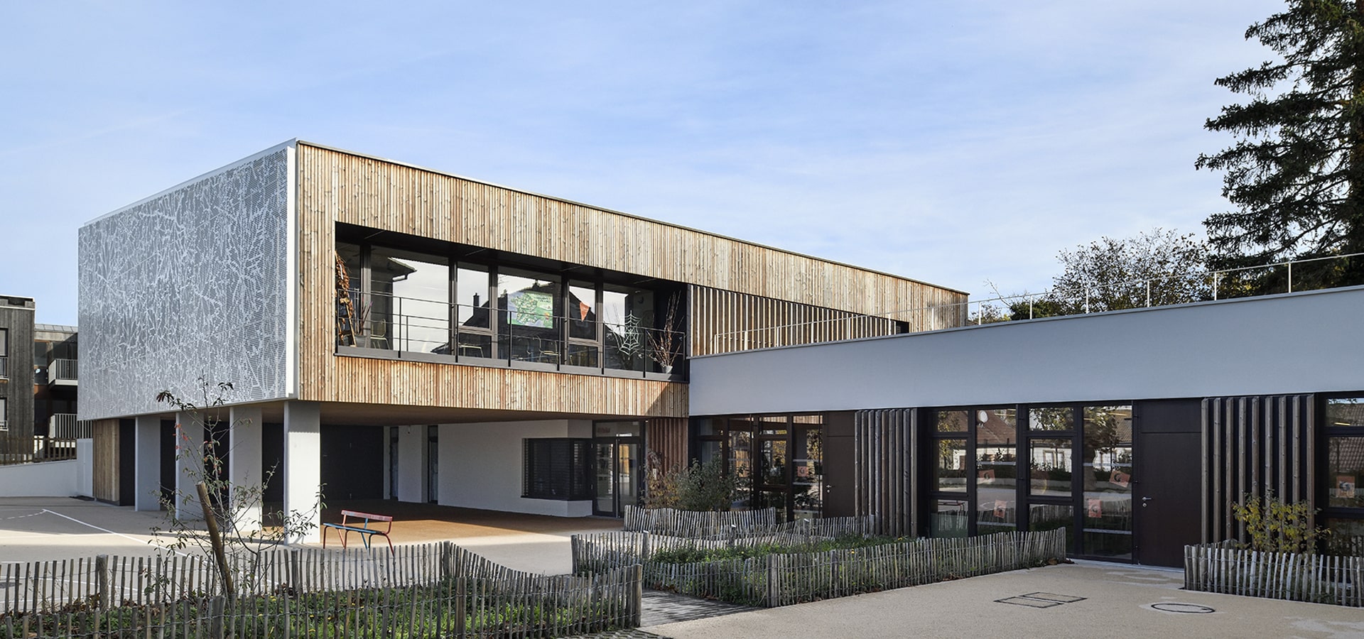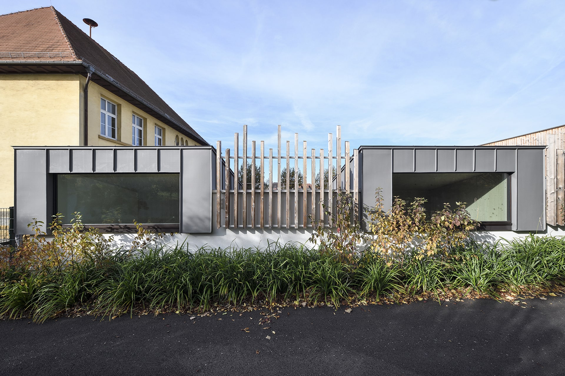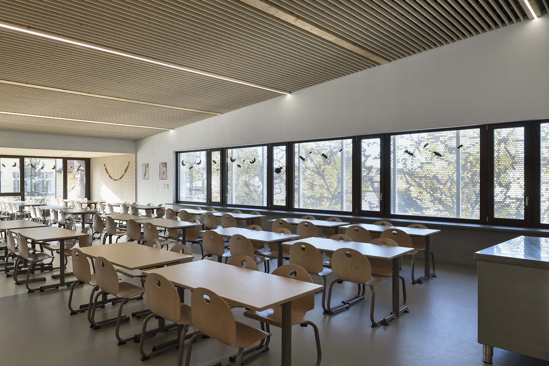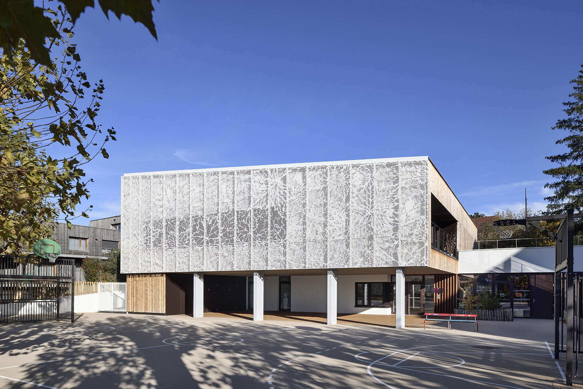 Il comprend deux niveaux décalés entre eux ; cette disposition volumétrique permet ainsi au nouveau préau de prendre naturellement place sous le restaurant, et au regard de filer vers l'ouest depuis le chemin et les jardins inter-générationnels par-dessus le volume en rez-de-chaussée seul et peu émergeant des salles d'activités.