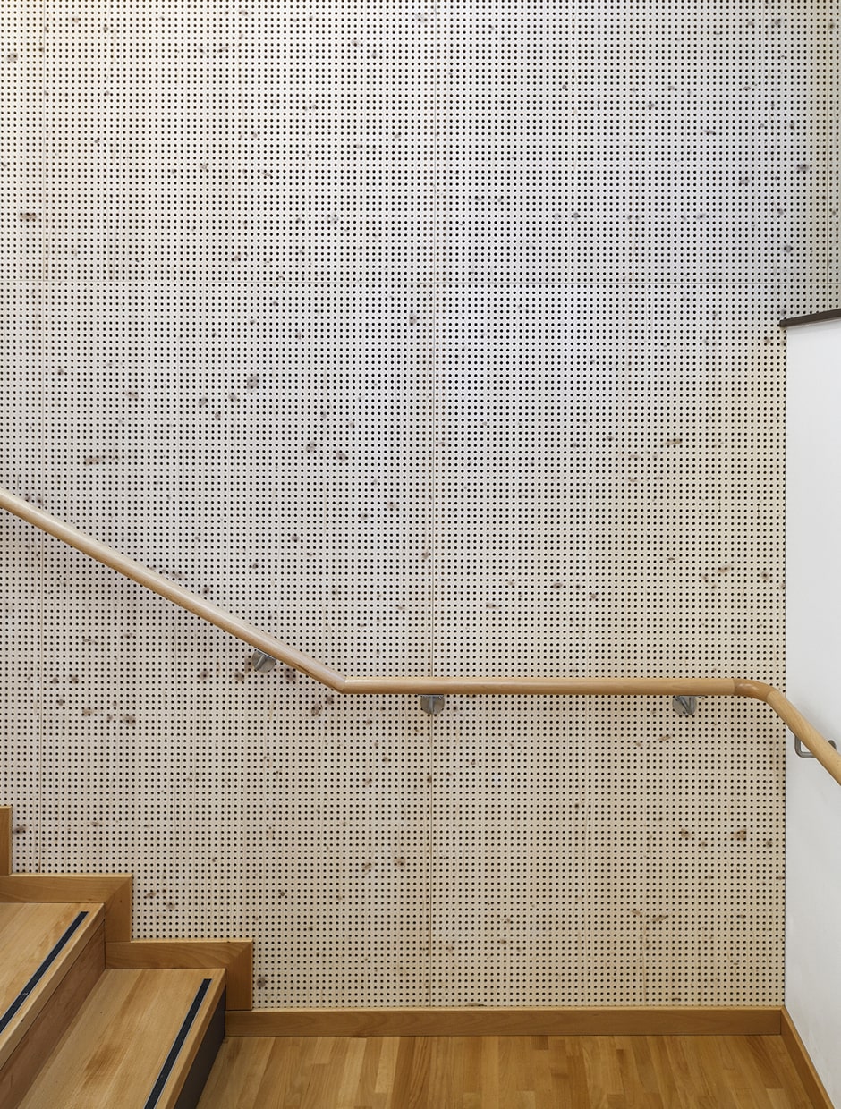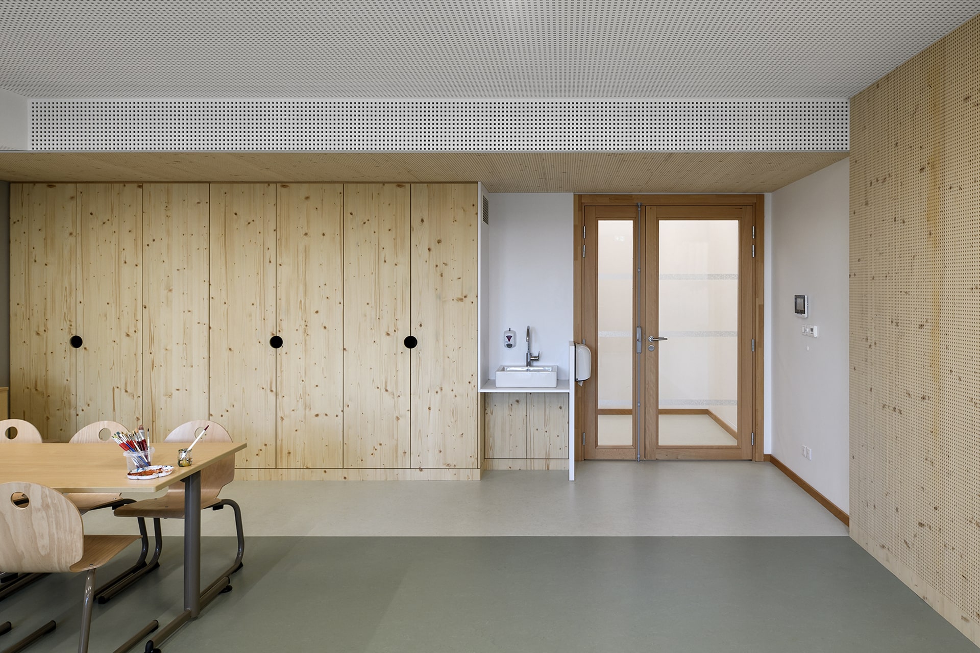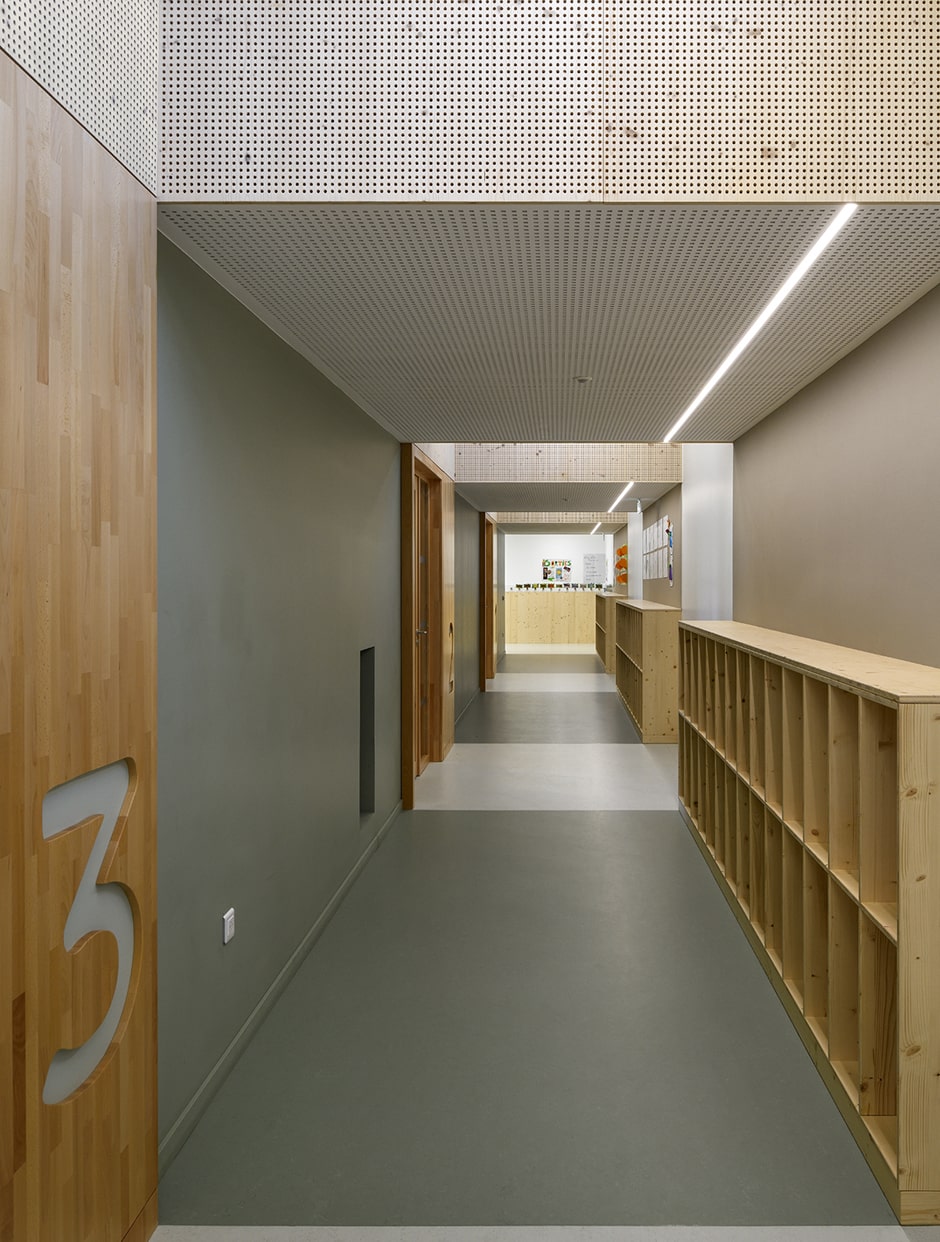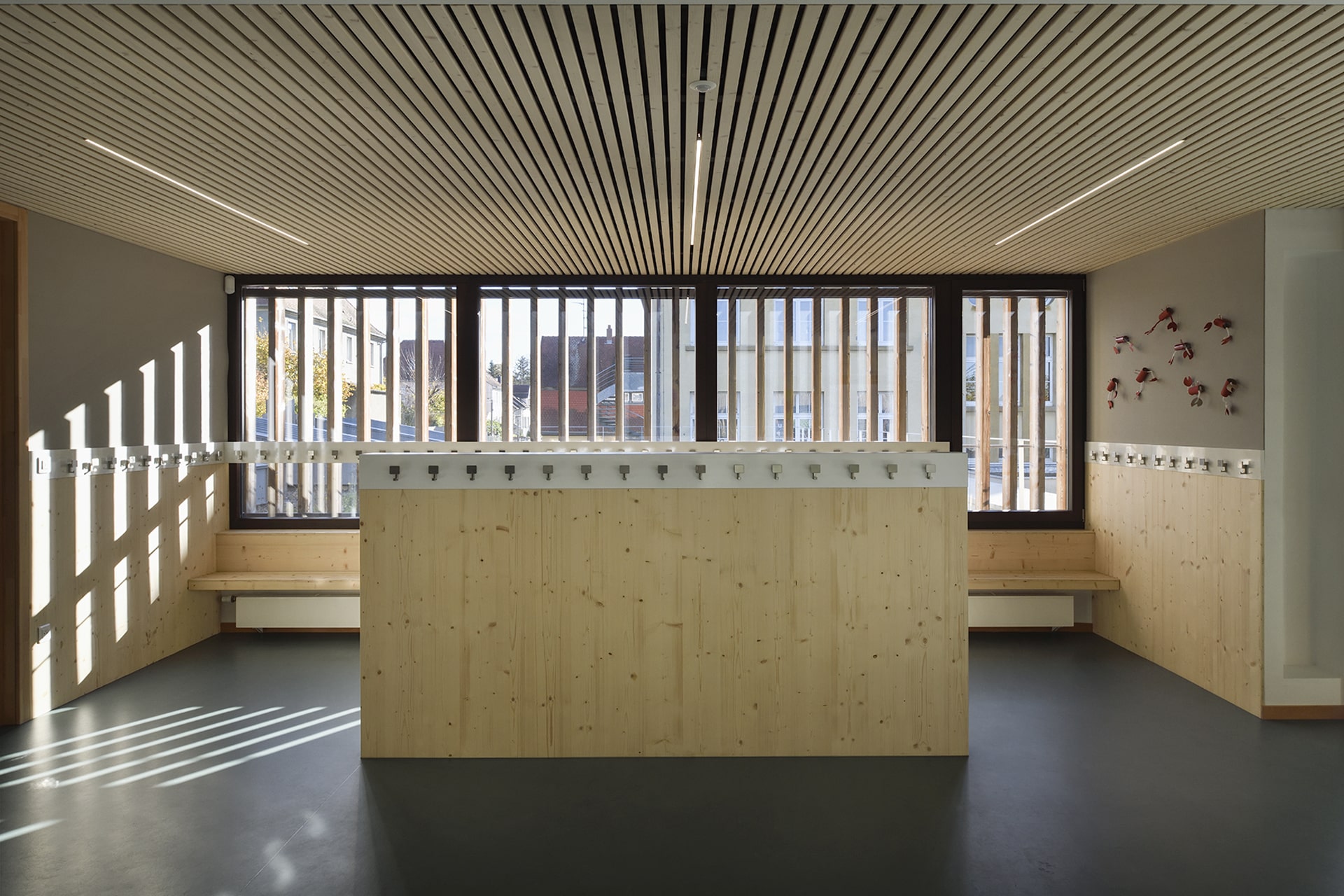 Il comprend deux niveaux décalés entre eux ; cette disposition volumétrique permet ainsi au nouveau préau de prendre naturellement place sous le restaurant, et au regard de filer vers l'ouest depuis le chemin et les jardins inter-générationnels par-dessus le volume en rez-de-chaussée seul et peu émergeant des salles d'activités.