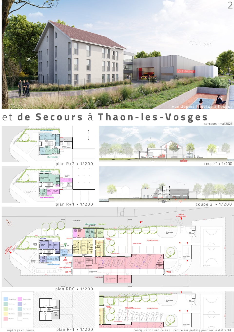 • les pôles fonctionnels (opérationnel, vestiaires, sport, vie, administration, formation, hébergement) répartis dans les bâtiments conservés,