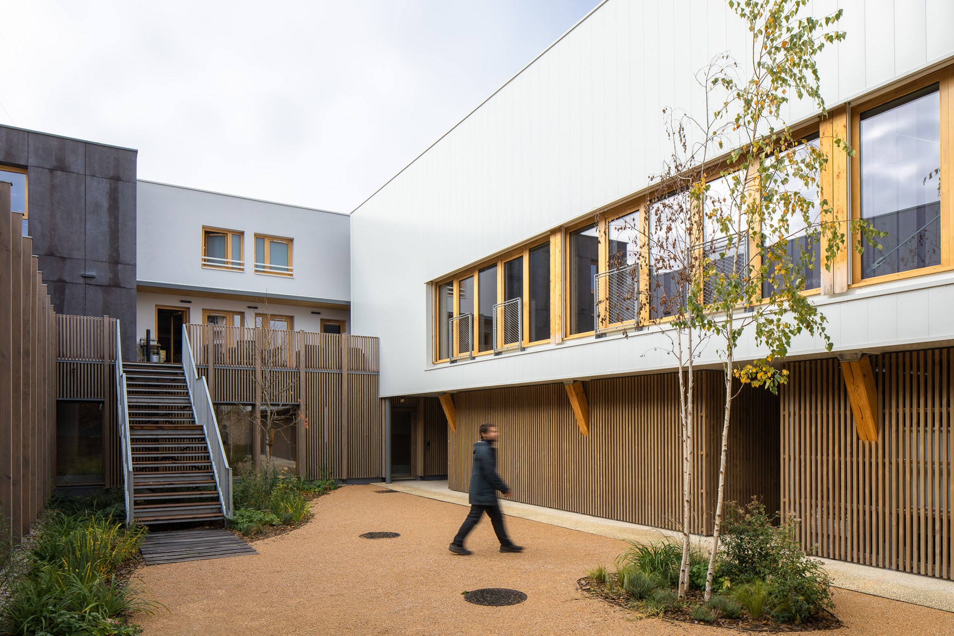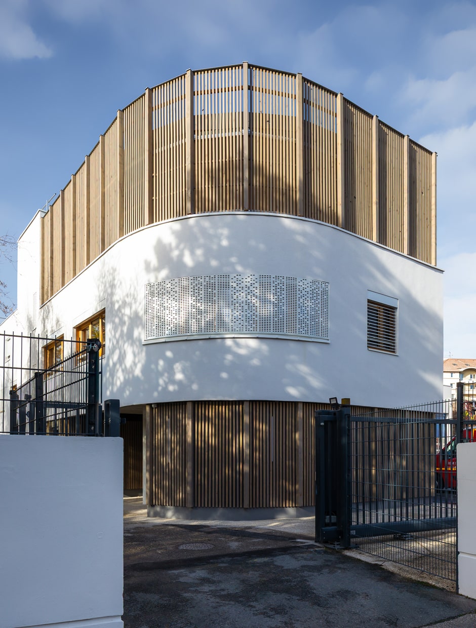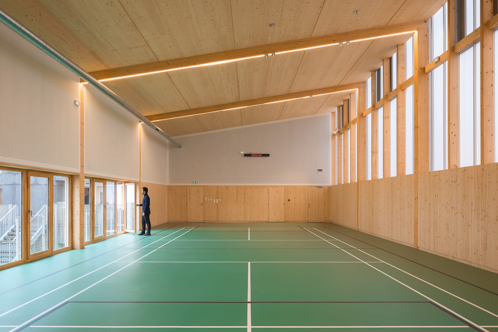 Le gymnase créé est positionné au nord de la parcelle, en R+1, ce qui permet de proposer plus de stationnements, tout en créant un espace extérieur protégé, sans atténuer la luminosité des locaux existants.