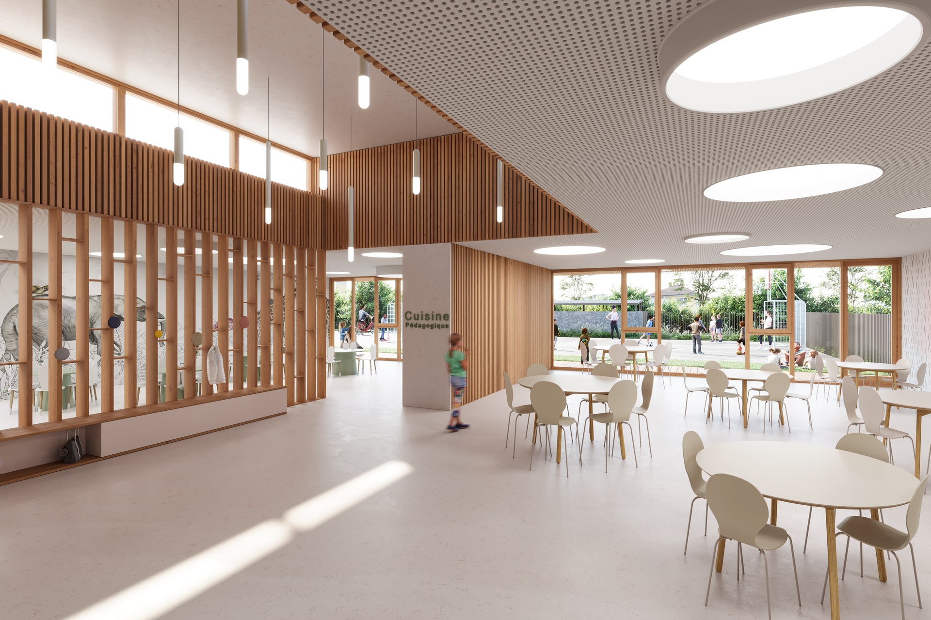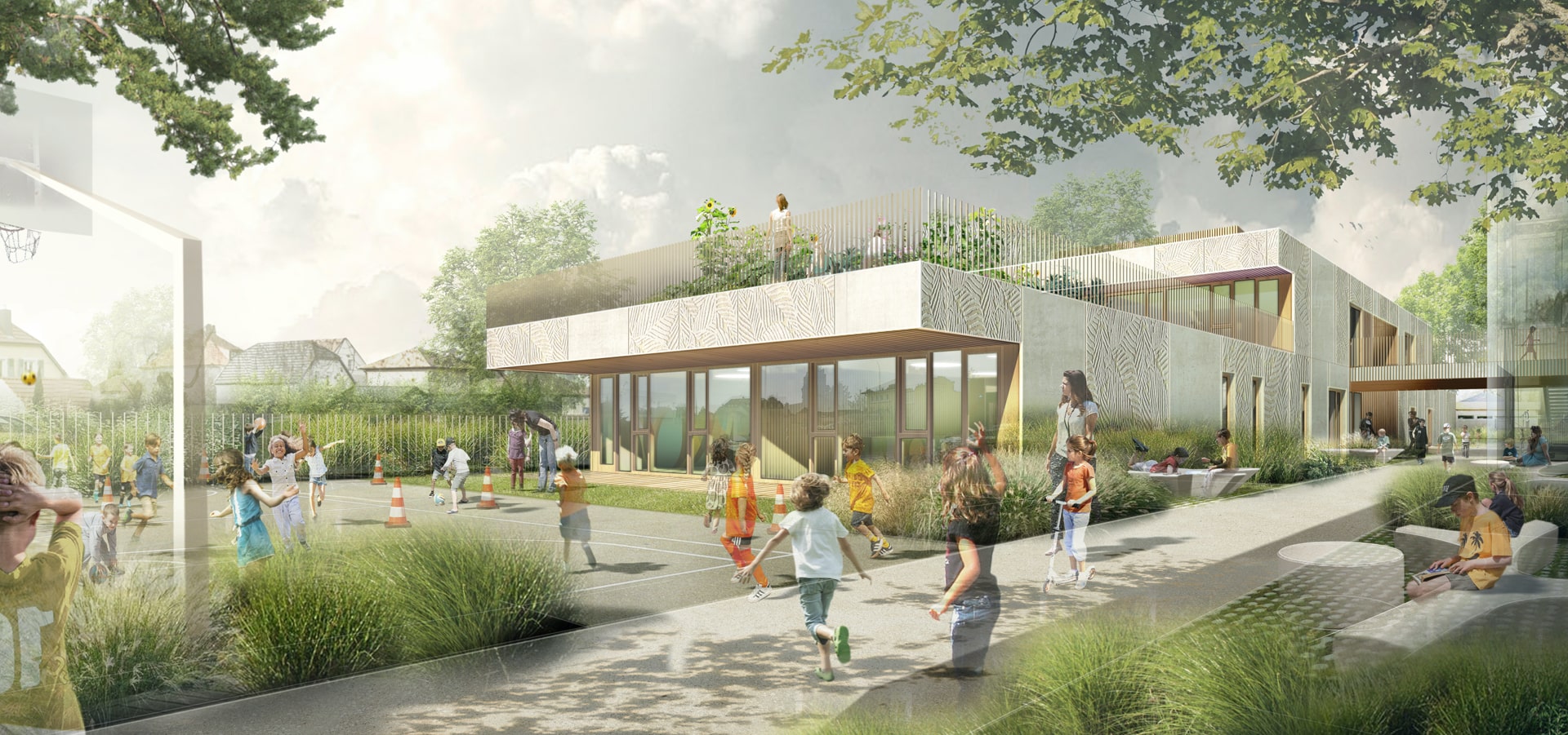 Sur un terrain fortement contraint, tout en longueur au nord derrière l’école Freinet, le projet est compact, sur deux niveaux, afin de dégager des espaces récréatifs importants.