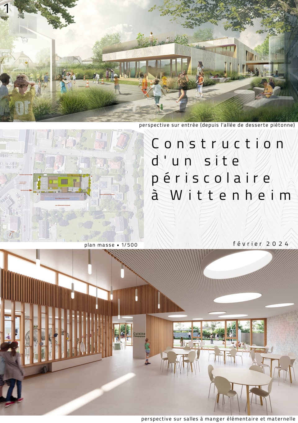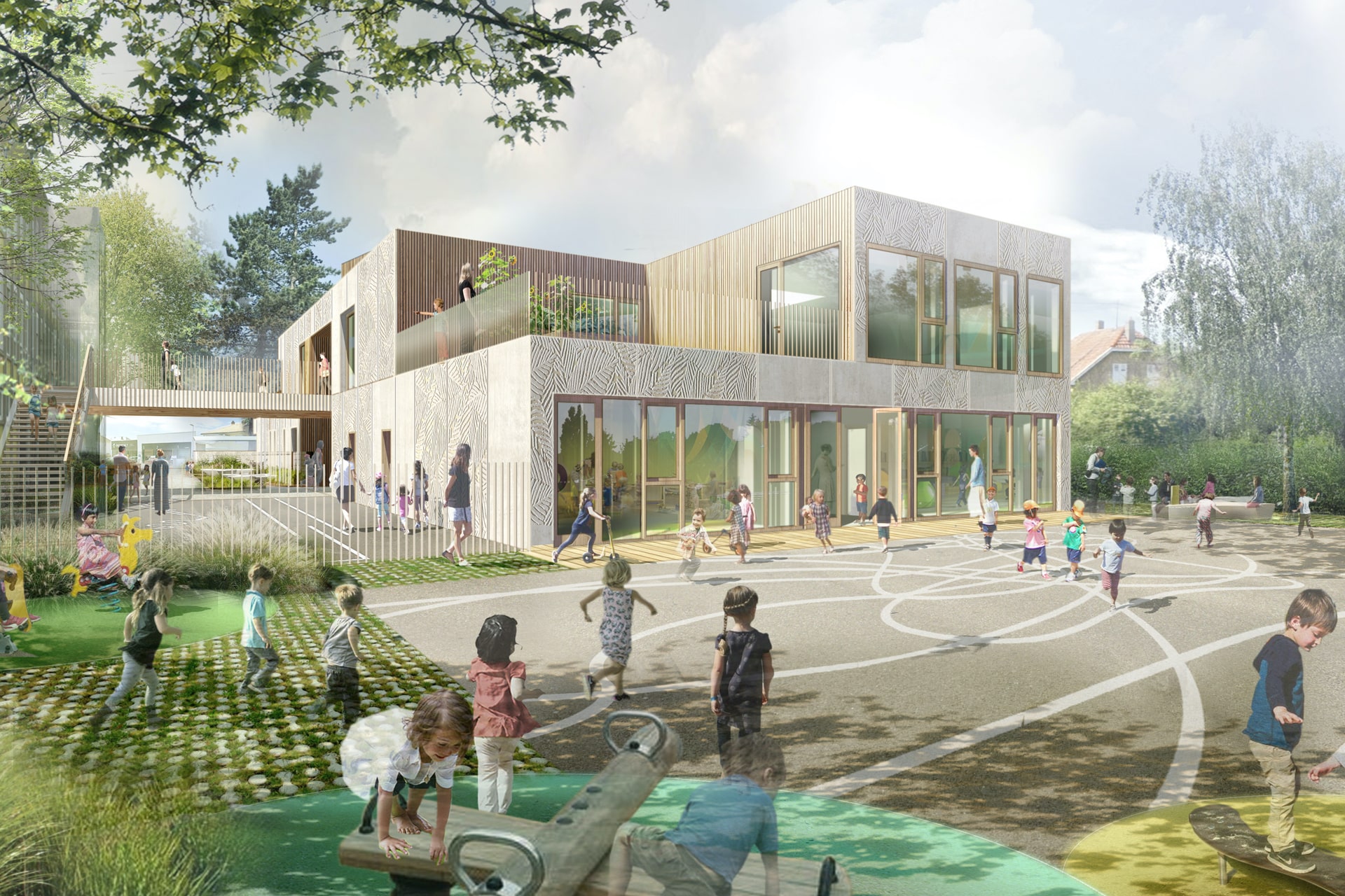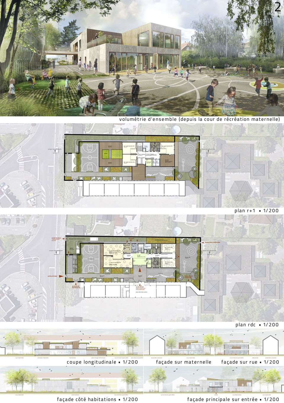 • au sud, la façade dialogue avec celle de l'école élémentaire existante (on y trouve l'entrée dans le bâtiment),